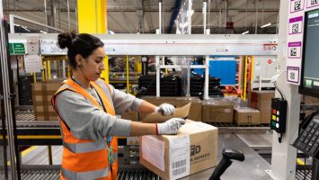 Magazijnmedewerkers in veiligheidshesjes en helmen die glimlachend samenwerken in een distributiecentrum in Venlo.